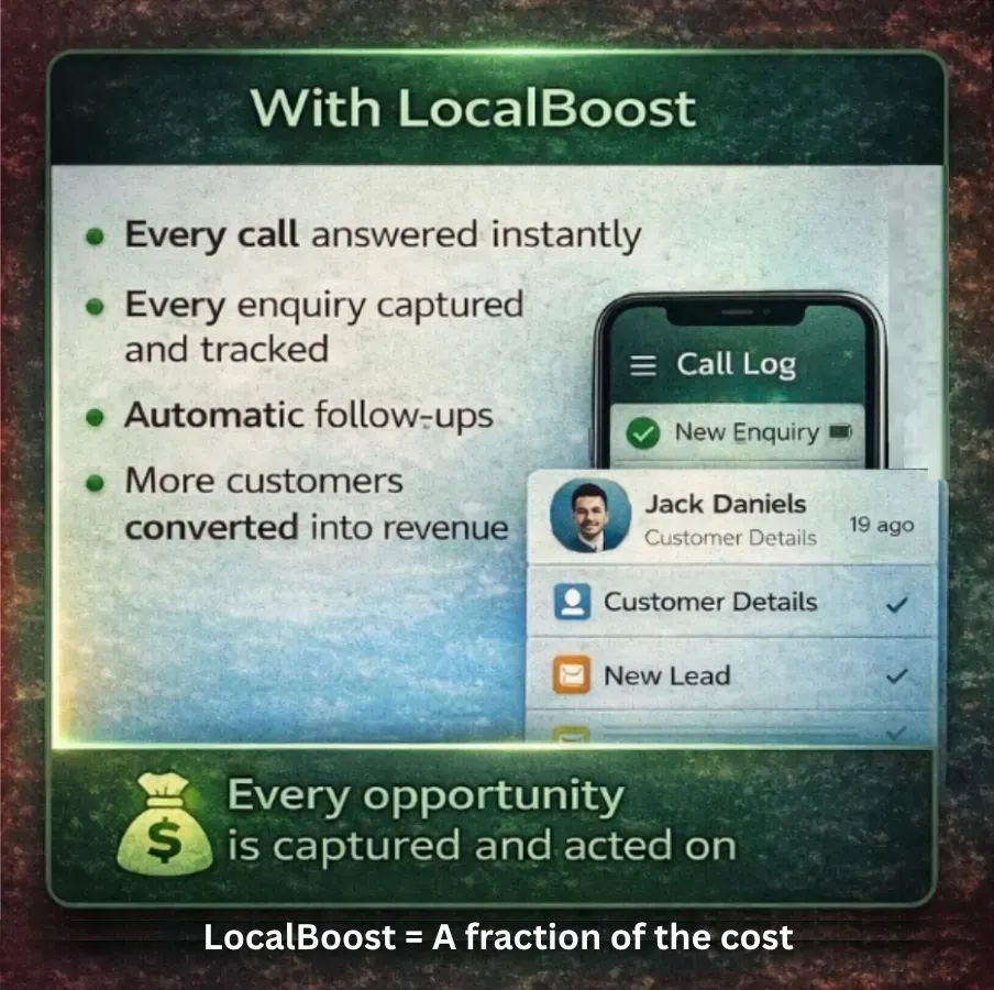 LocalBoost works quietly in the background to ensure every call, enquiry, and opportunity is captured and acted on automatically.